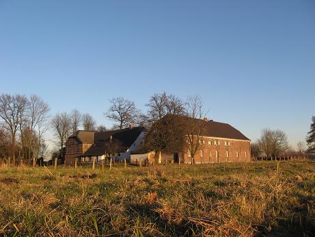 Marstall (links) und Mühlengebäude. Entlang des Stalls floss die Niers in die Mühle und trieb das Mühlrad an.