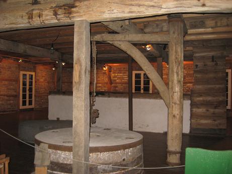 Das Mahlwerk. Sechs "dorische" Eichensäulen tragen die Mahlgänge.