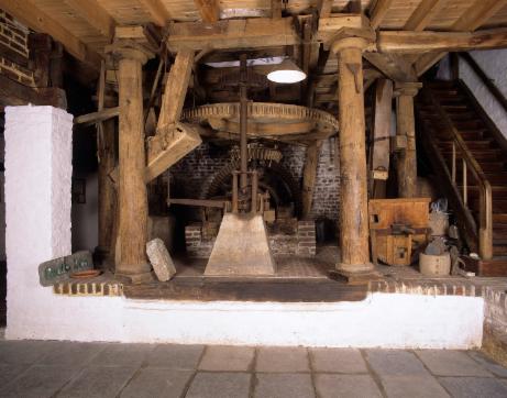 Blick in die obere Etage. Mittlerer Mahlgang, die Einhausung fehlt.